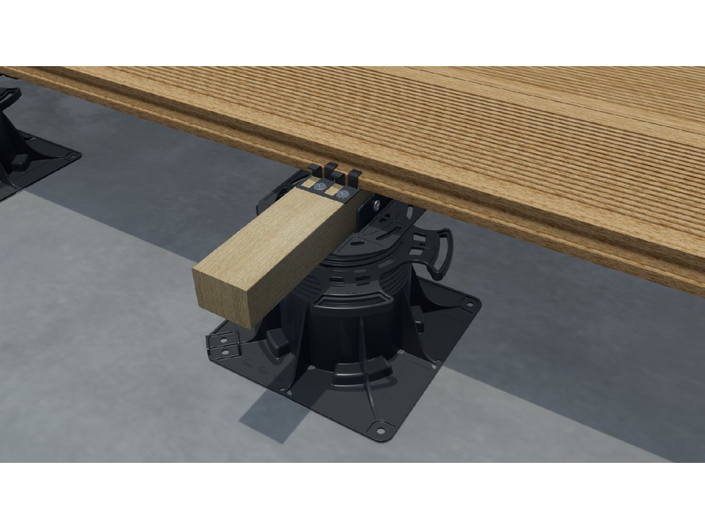 Podstavec se ukotví v předřezané drážce na boční distanční výčnělce pomocí šroubu a poté se přímo upevní na trám.