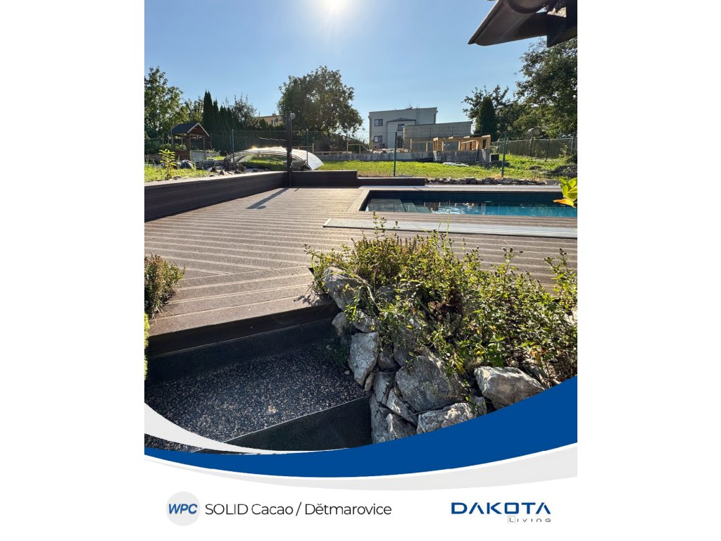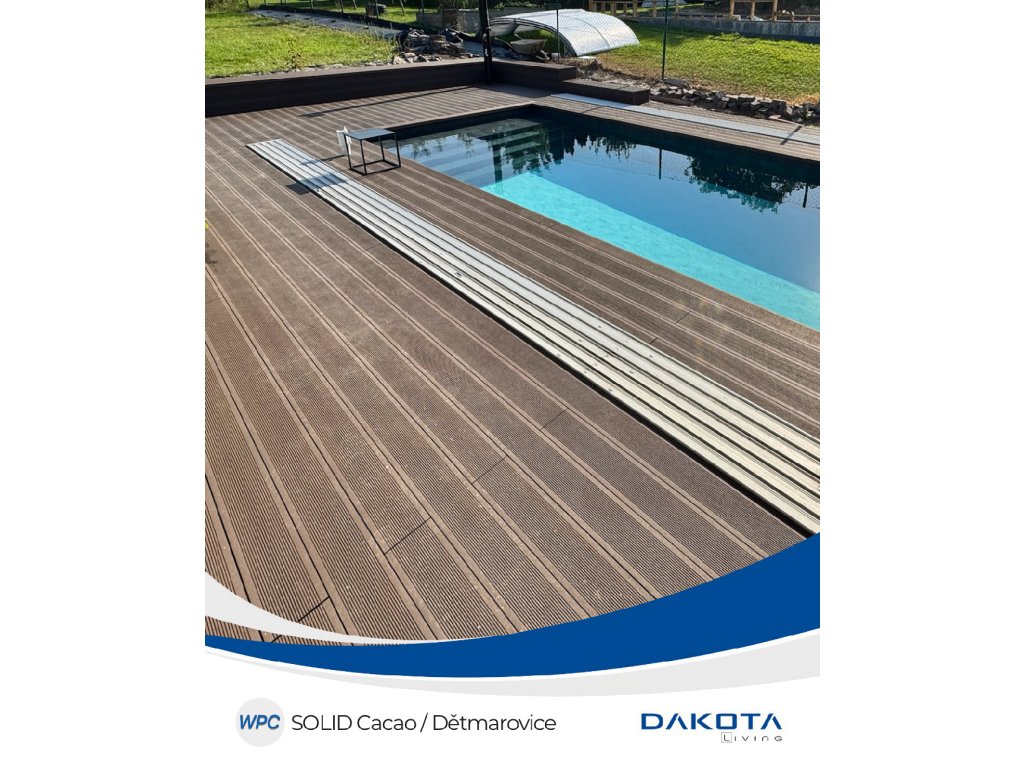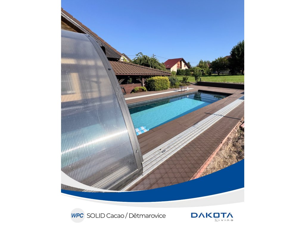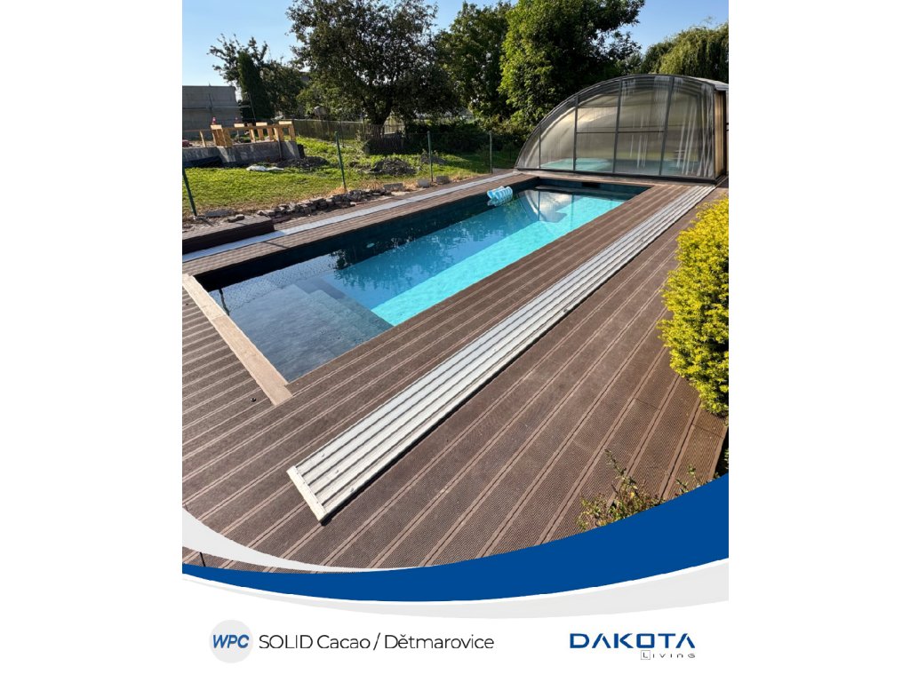 Montáž WPC terasových prken SOLID Cacao kolem bazénu. DĚTMAROVICE, Srpen 2025