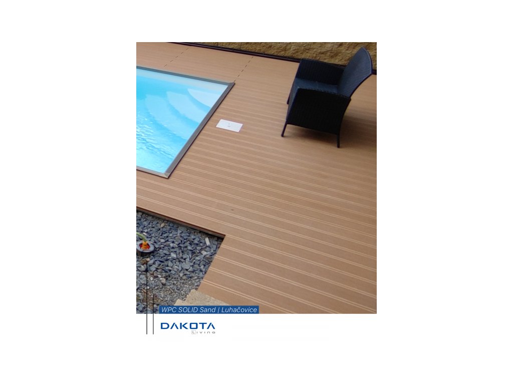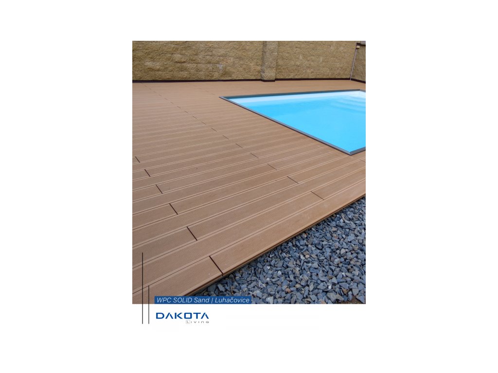 Montáž WPC terasových prken SOLID Sand kolem bazénu, Luhačovice, Červenec 2021